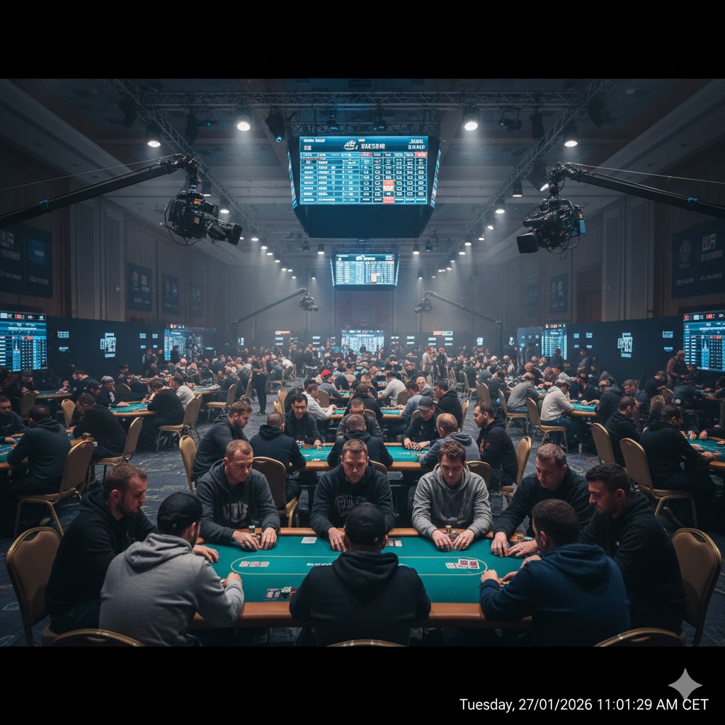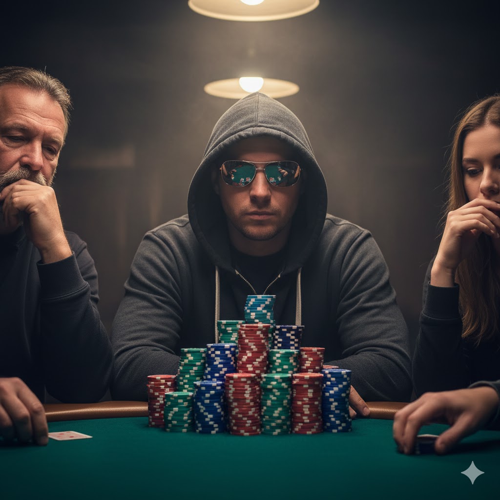 Bildeliste: create image for; poker-featured.jpg – “Et profesjonelt pokerbord med grønn filt, sjetonger stablet opp, og en dealer som deler ut kort i et elegant casinomiljø.” create image for; poker-texas-holdem.jpg – “Nærbilde av to kort (hole cards) på et bord sammen med fem felleskort (community cards), med fokus på en spennende flop.” create image for; poker-psychology.jpg – “En pokerspiller med solbriller og hettegenser som observerer motstanderne sine intenst over en stor bunke med sjetonger.” create image for; poker-tournament.jpg – “En stor pokersal fylt med mange bord, spillere og TV-kameraer, som fanger atmosfæren i en stor internasjonal turnering.”